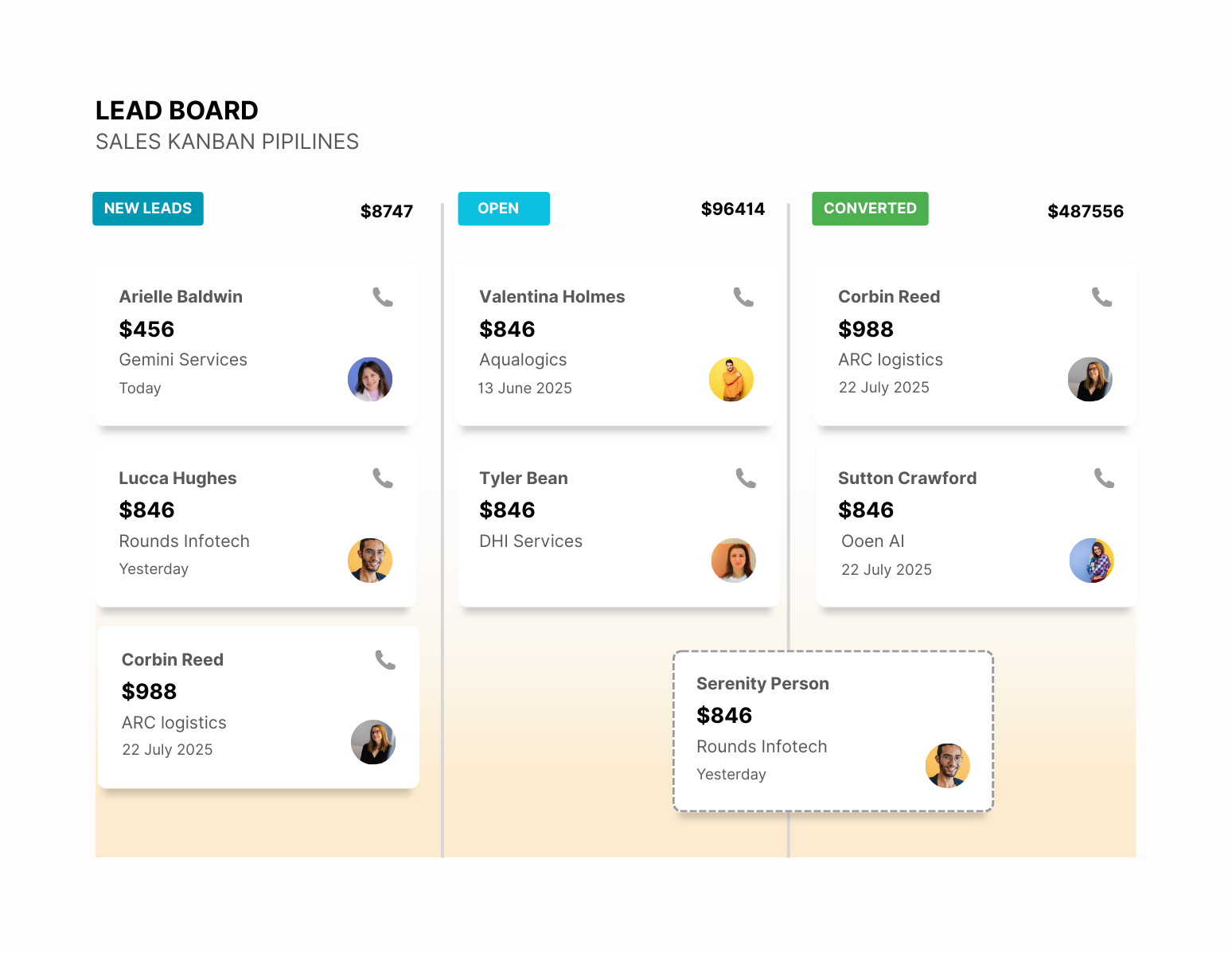 Track, update, and manage sales leads through a structured Kanban interface. Monitor progress across pipeline stages, maintain complete visibility, and streamline deal management with an organized, process-driven workflow